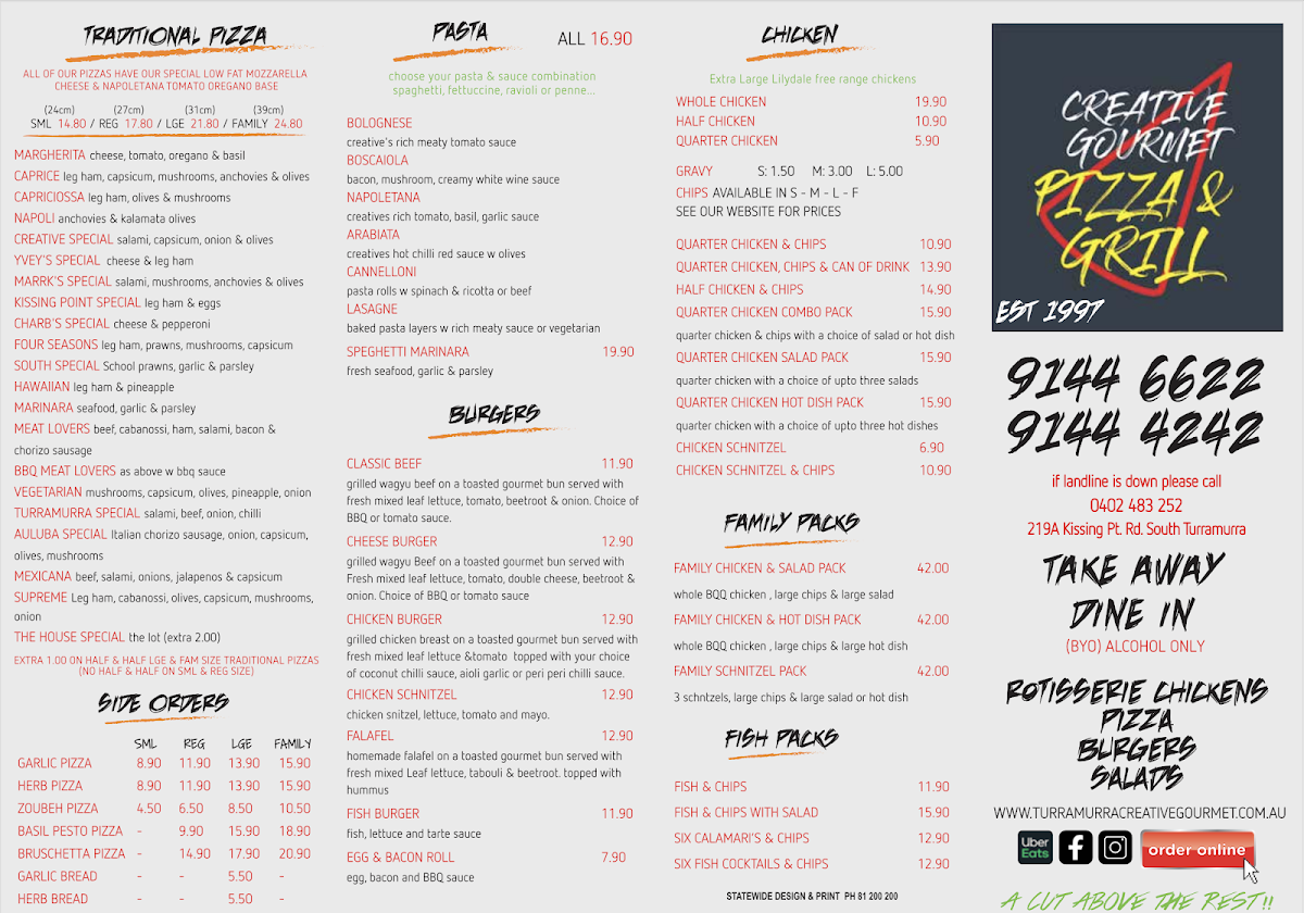 Welcome to Creative Gourmet Pizza and Grill, your local gem nestled in South Turramurra, NSW. This family-run Italian restaurant is adored by the community for its welcoming atmosphere and exceptional service. Customers rave about the fantastic pizzas, from the mouthwatering "lot" pizza that’s both mountainous and satisfying to the inventive prawns with satay sauce. The menu also features home-cooked meals, including juicy quarter chickens and crispy chips.